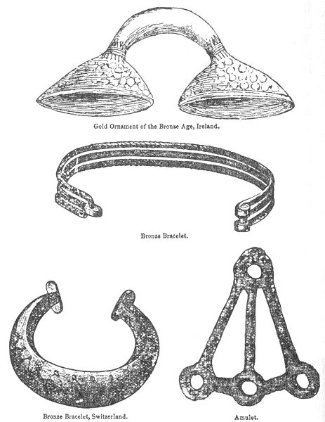 but by the beauty and variety of the articles made from it. We find not only, as before, during the Stone Age, axes, arrows, and knives, but, in addition, swords, lances, sickles, fish-hooks, ear-rings, bracelets, pins, rings, and a variety of other articles."