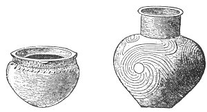 We find a great resemblance between the pottery of the Bronze Age in Europe and the pottery of the ancient inhabitants of America. The two figures on page 260 represent vases from one of the mounds of the Mississippi Valley. Compare them with the following from the lake dwellings of Switzerland: