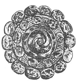 A favorite design of the men of the Bronze Age in Europe is the spiral or double-spiral form. It appears on the face of the urn in the shape of a lake dwelling, which is given on p. 255; it also appears in the rock sculptures of Argyleshire, Scotland, here shown.