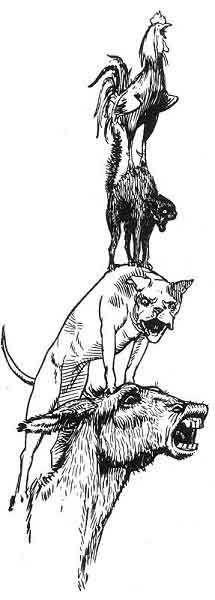 So the ass put his fore-hoofs on the sill of the window, the dog got on the ass's head, the cat on the dog's head, and the cock on the cat's head. Then Jack made a sign, and they all sung out like mad.