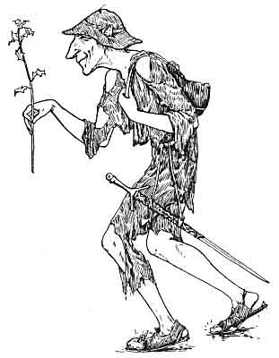 shoes full of cold road-a-wayish water sousing about him, the tips of his two ears out through his old hat, his two shoulders out through his scant tattered cloak, and in his hand a green wand of holly.