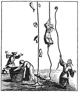Parallels.--Campbell gives another variant, l.c. i. 318. Dr. Hyde has an Irish version of Campbell's tale written down in 1762, from which he gives the incident of the air-ladder (which i have had to euphemise in my version) in his Beside the Fireside, p.191, and other passages in his Preface. The most remarkable parallel to this incident, however, is afforded by the feats of Indian jugglers reported briefly by Marco Polo, and illustrated with his usual wealth of learning by the late Sir Henry Yule, in his edition, vol. i. p.308 seq. The accompanying illustration (reduced from Yule) will tell its own tale: it is taken from the Dutch account of the travels of an English sailor, E. Melton, Zeldzaame Reizen, 1702, p.468. It tells the tale in five acts, all included in one sketch. Another instance quoted by Yule is still more parallel, so to speak. The twenty-third trick performed by some conjurors before the Emperor Jahangueir (Memoirs, p. 102) is thus described: "They produced a chain of 50 cubits in length, and in my presence threw one end of it towards the sky, where it remained as if fastened to something in the air. A dog was then brought forward, and being placed at the lower end of the chain, immediately