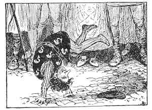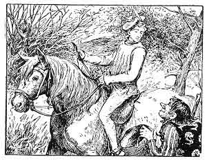 As he journeyed on his thoughts naturally turned to the adventure before him, and in a brown study he let the mare jog along as she chose, taking no heed of anything till, with a start, he was aroused by a squeaky little voice beside him, which struck him as strangely familiar. Looking down, he was aware of a little man walking by his side, with a face exactly