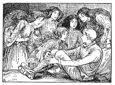 In less time than I write this, there was a rare tapping at the door, and as the hind bid them enter the five green maidens hurried into the house.