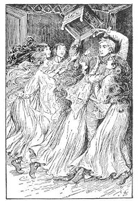 But with a bang all the five doors of the five presses opened, and before he could say with your leave or by your leave, Gille Macdonald found himself surrounded by five maidens in seagreen-coloured attire, who clasped him round the neck and arms, kissing, tickling, and nearly throttling him, all the time laughing and giggling like wild lunatics.