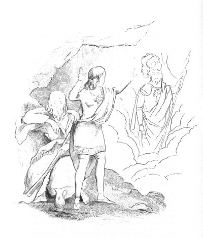 He gave the spear to my hand, and raised at once a stone on high, to speak to future times, with its gray head of moss. Beneath he placed a sword in earth, and one bright boss from his shield. Dark in thought awhile he bends: his words at length came forth.