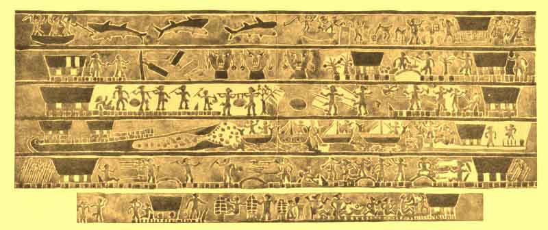 Portion of the carved and painted decoration on the beams of a priest-king's house in the Pelew Islands. The scenes represent episodes in myth and legend, but the particular story to which this series relates is not known. After Meyer, Bilderschriften des ostindischen Archipels und der Südsee, i, Plate III.
