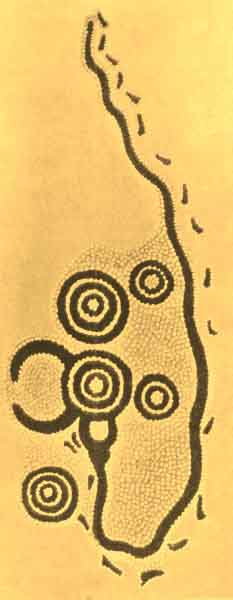 Ground-painting, made with coloured sands, representing a mythical snake, which is shown descending into a hole in the ground. The other series of concentric circles stand for trees and bushes; the footprints are those of a man who followed the snake. The paintings are used in connexion with ceremonials of the snake-totem clan. Australia. After Spencer and Gillen, Northern Tribes of Central Australia, p. 740, Fig. 312.