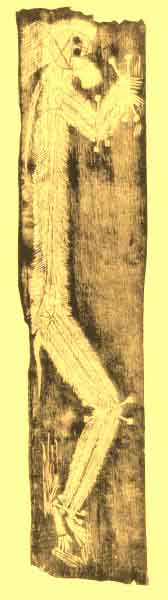 Native drawing of a sort of ghoulish spirit called Auuenau. They are thought to be very thin and hairy. From their wrists, elbows, knees, etc., hang human bones taken from the dead, whom they seek to devour. The tail-like appendage is supposed to be the summer lightning, which is a sign of their presence. Geimbio tribe, Northern Territory, Australia. After Spencer, Native Tribes of the Northern Territory of Australia, Fig. 80.