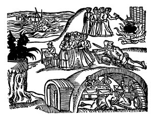 Item, the saide Agnis Tompson was after brought againe before the Kings Maiestie and his Counsell, and being examined of the meetings and detestable dealings of those witches, she confessed that vpon the night of Allhollon Euen last, she was accompanied aswell with the persons aforesaide, as also with a great many other witches, to the number of two hundreth: and that all they together went by Sea each one in a Riddle or Ciue, {sieve?--jbh} and went in the same very substantially with Flaggons of wine making merrie and drinking by the waye in the same Riddles or Ciues, to the Kerke of North Barrick in Lowthian, and that after they had landed, tooke handes on the land and daunced this reill or short daunce, singing all with one voice.