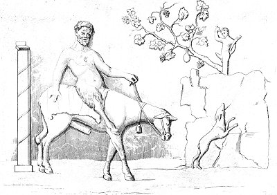 An oak extends its vigorous branches over the Hermes: this tree was consecrated to Priapus, to Pan, and to all the rural divinities. To one of the branches is suspended a cymbal, the offering of a devout Bacchante, and at the foot of the tree may be seen a little altar, surrounded by a