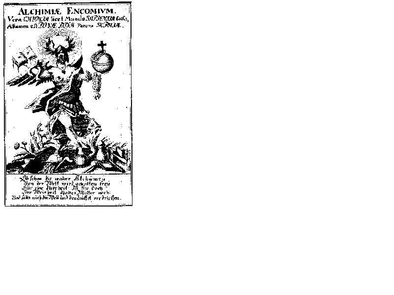 Theology without alchemy is like a noble body without its right hand. This is graphically shewn and exhibited in the picture before us. First look at the helmet and the two wings, which signify the love of the Art. They bear us onward to Sophia (Wisdom), who is bright like Phoebus. Her body is naked because she is ardently loved. She is loved because she has at her disposal the riches of the whole world. He that gazes upon her beauteous form cannot refrain himself from loving her, goddess as she is. Although this love is, as it were, hidden, yet it is constant; and that is indicated by the mask. Her heart is sincere, her words are modest, righteousness upholds her steps, she is free from malice and guile. Her valiant appearance shews that she is of an open mind. Yet she seems to be falling too: that is because the base world hates her, and with fierce truculence tries to cast her down to the ground. But evermore she bravely rises on high though ambition moves her not. She is beloved by God and man. Though mockery is to her for a garment, as is shewn by the noisy cymbals, yet she cares nothing for it, but cleaves all the more faithfully to wisdom; to it she lifts her eyes, to it she directs her steps. For she knows that it is the only true salvation, and therefore she occupies herself with it by day and by night. She is not anxious for worldly praise, nor does she heed the hatred and injustice of men, or care for their opinion too little or too much. Much suffering and tribulation are inflicted upon her by this wicked world, yet she bears it with a valiant heart and holds it in disdain. For she possesses the treasure which gives her all that she desires, and avarice dwells not in her thoughts. That in which the world delights, she accounts as the dirt beneath her feet, since fortune is a wheel, and its revolutions are swift. Therefore she delights to tread the path of thorns, until, leaving the world, she finds rest in the tomb. Then her righteous soul will soar aloft to heaven, and for a just reward there shall be given unto her a diadem of stars. After her death, her praise and glory shall wax bright in the world, like unto the glorious splendour of the sun ; nor will it ever pale, but become more intense as the years advance, and her name shall shine like a bright star for evermore.
