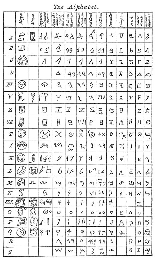 [Transcribers note: the argument in this section heavily depends on the Bishop Landa Maya alphabet, which has now been discredited. The Mayan writing was not decoded until late in the 20th Century. Mayan hieroglyphs are ideographic with a phonetic component, albeit not the ones that Landa described. The only thing demonstrated in this section is the evolution of the alphabet in the Old World, which has no bearing on the question of Atlantis--jbh]