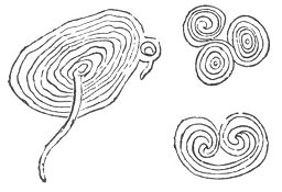 A favorite design of the men of the Bronze Age in Europe is the spiral or double-spiral form. It appears on the face of the urn in the shape of a lake dwelling, which is given on p. 255; it also appears in the rock sculptures of Argyleshire, Scotland, here shown.
