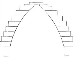We find a strong resemblance between the form of arch used in the architecture of Central America and that of the oldest buildings of Greece. The Palenque arch is made by the gradual overlapping of the strata of the building, as shown in the accompanying cut from Baldwin's "Ancient America," page 100. It was the custom of these ancient architects to fill in the arch itself with masonry, as shown in the picture