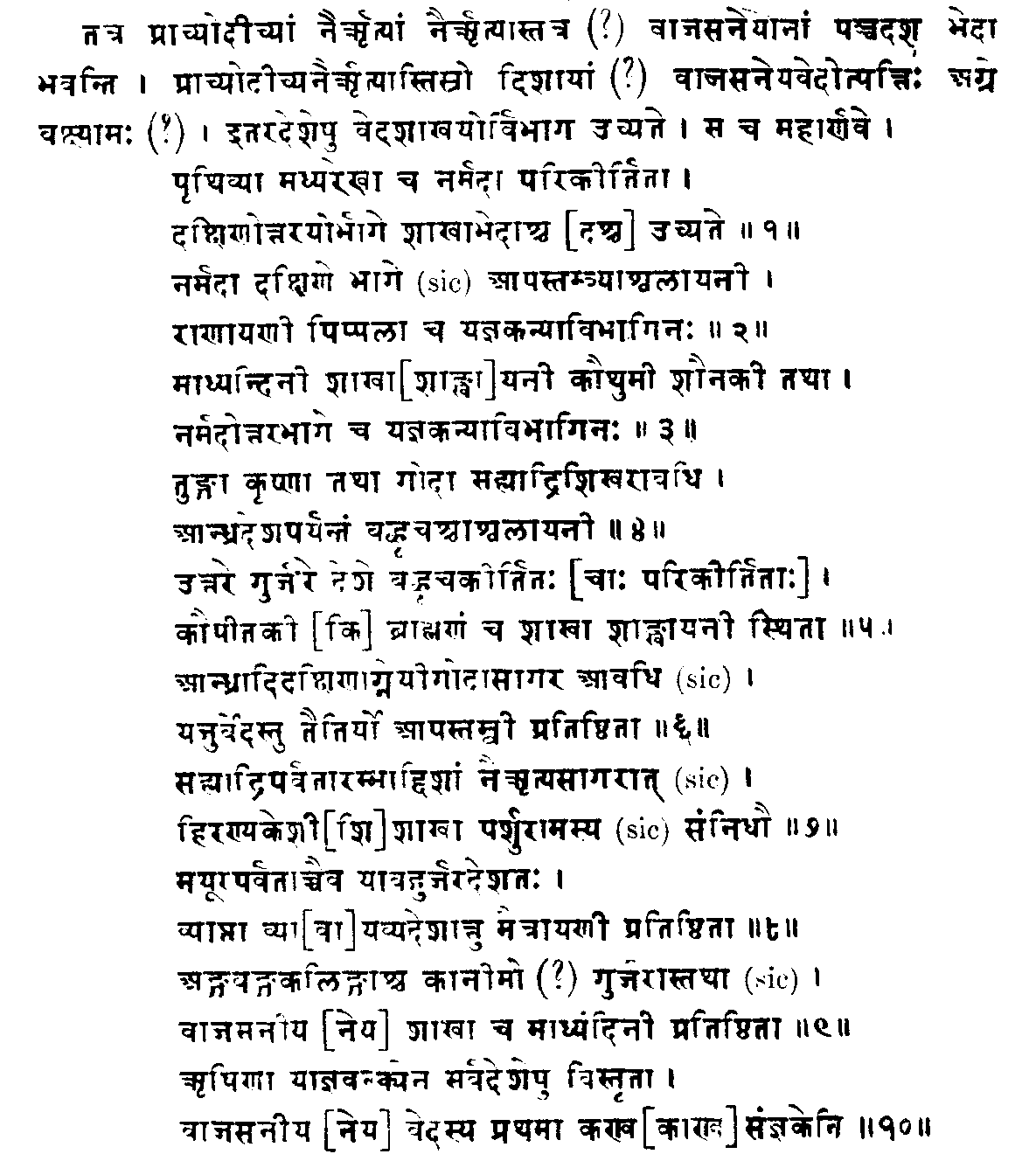 though written in barbarous Sanskrit, and of quite modern origin, possesses great interest, because its description of the geographical distribution of the Vedas and Vedic schools is not mentioned elsewhere. The verses from a work entitled Mahânava, which are quoted there, state that the earth, i.e. India, is divided into two equal halves by the river Narmadâ (Nerbudda). and that the school of Âpastamba prevails in the southern half (ver. 2). It is further alleged (ver. 6) that the Yagur-veda of Tittiri and the Âpastambîya school are established in the Ândhra country and other parts of the south and soutth-east up to the mouth of the Godâvari (godâsâgara-âvadhi). According to the Mahârnava the latter river marks, therefore, the northern frontier of the territory occupied by the Âpastambîyas. which comprises the Marâtha and Kânara districts of the Bombay Presidency, the greater part of the Nizâm's dominions, Berar, and the Madras Presidency with the exception of the northern Sirkârs and the western coast. This assertion agrees, on the whole, with the actual facts which have fallen under my observation. A great number of the Desastha-brâhmanas in the Nâsik, Puna, Ahniadnagar, Sâtârâ, Sholâpur, and Kolhâpur districts, and of the Kânari or Karnâtaka-brâhmanas in the Belgâm, Dhârvâd, Kalâdghî, and Karvâd collectorates, as well as a smaller number among the Kittapâvanas of the Konkana are Âpastambîyas. Of the Nizâm's dominions and the Madras Presidency I possess no local knowledge. But I can say that I have met many followers of Âpastamba among the Telingana-brâhmanas settled in Bombay, and that the frequent occurrence of MSS. containing the Sûtras of the Âpastambîya school in the Madras Presidency proves that the Karana there must count many adherents. On the other hand, I have never met with any Âpastambîyas among the ancient indigenous subdivisions of the Brahmanical community dwelliing north of the Marâthi country and north of the Narmadâ. A few Brâhmanas of this school, no doubt, are scattered over Gugarât and Central India, and others are found in the great places of pilgrimage in Hindustan proper. The former mostly have immigrated during the last century, following the Marâthâ chieftains who conquered large portions of those countries, or have been imported in the present century by the Marâthâ rulers of Gwalior, Indor, and Baroda. The settlers in Benares, Mathurâ, and other sacred cities also. have chiefly come in modern times, and not unfrequently live on the bounty of the Marâthâ princes. But all of them consider themselves and are considered by the Brâhmanas, who are indigenous in those districts and towns, as aliens, with whom intermarriage and commensality are not permitted. The indigenous sections of the Brâhmanas of Gugarât, such as the Nâgaras, Khedâvals, Bhârgavas, Kapilas, and Motâlâs, belong, if they arc adherents of the Yagur-veda, to the Mâdhyandina or Kânva schools of the White Yagur-veda. The same is the case with the Brâhmanas of Ragputâna, Hindustan, and the Paiñgab. In Central India, too, the White Yagur-veda prevails; but, besides the two schools mentioned above, there are still some colonies of Maitrâyanîyas or Mânavas[1]. It seems, also, that the restriction of the Âpastambîya school to the south of India, or rather to those subdivisions of the Brahmanical community which for a long time have been settled in the south and are generally considered as natives of the south, is not of recent date. For it is a significant fact that the numerous ancient landgrants which have been found all over India indicate exactly the same state of things. I am not aware that in any grant issued by a king of a northern dynasty to Brâhmanas who are natives of the northern half of India, an Âpastambîya is mentioned as donee. But among the southern landgrants there are several on which the name of the school appears. Thus in a sasana of king Harihara of Vidyânagara, dated Sakasamvat 1317 or 1395 A.D., one of the recipients of the royal bounty is 'the learned Ananta Dikshita, son of Râmabhatta, chief