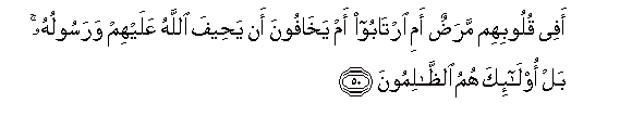 50. Afee quloobihim maradun ami irtaboo am yakhafoona an yaheefa Allahu AAalayhim warasooluhu bal ola-ika humu alththalimoona