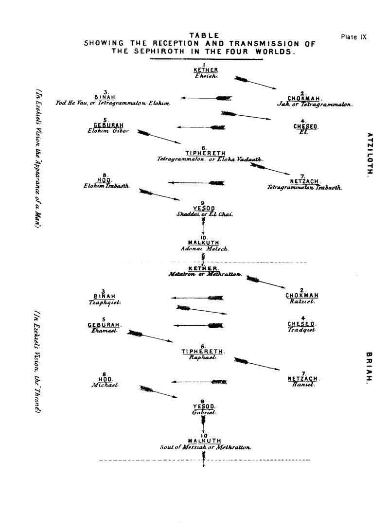 [The Tetragrammaton (see Introduction, § 67) comprehends the whole ten Sephiroth, and consequently expresses their three trinities of balanced force also; consequently, when the Tetragrammaton appears, the formless and the void and the darkness disappear, and form, fulness, and light replace them.]