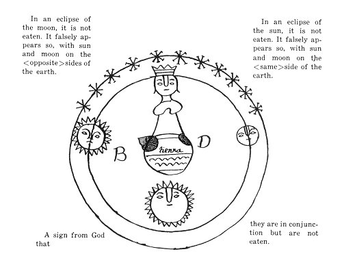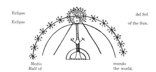 To the people on the sides of this half-section as pictured, the sun is not eclipsed; 2 but for anyone who is in the middle it is eclipsed. It is in conjunction with the moon when it is eclipsed. It travels in its course before it is eclipsed. It arrives in its course to the north, very great. It is all the same with eclipses of the sun and moon before it arrives opposite to the sun. <This is> the explanation so that Maya people may know what happens to the sun and to the Moon.
