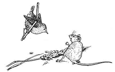 He struck again, and he struck off two grains. Out came the mouse and she eats them. So they arranged a contest to see who was strongest, and the wren brings his twelve birds, and the mouse her tribe.