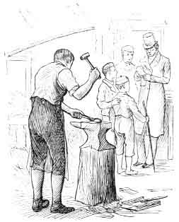 Winding up a hill to the right, as you quit the inn, is the beautiful road to the cottage and park of Lord Bantry. One or two parties on pleasure bent went so far as the house, and were partially consoled for the dreadful rain which presently poured down upon them, by wine, whiskey, and refreshments which the liberal owner of the house sent out to them. I myself had only got a few hundred yards when the rain overtook me, and sent me for refuge into a shed, where a blacksmith had arranged a rude furnace and bellows, and where he was at work, with a rough gilly to help him, and of course a lounger or two to look on.