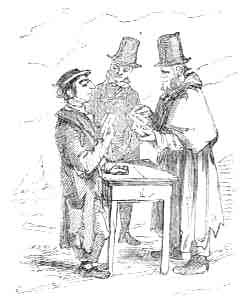 Thimble-rig too obtained somewhat, though in a humble way. A ragged scoundrel--the image of Hogarth's Bad Apprentice--went bustling and shouting through the crowd with his dirty tray and thimble, and as soon as he had taken his post, stated that this was the "royal game of thimble" and called upon "gintlemen" to come forward. And then a ragged fellow would be seen to approach, with as innocent an air as he could assume, and the bystanders might remark that the second ragged fellow almost always won. Nay, he was so benevolent, in many instances, as to point out to various people who had a mind to bet, under which thimble the pea actually was. Meanwhile, the first fellow was sure to be looking away and talking to some one in the crowd; but somehow it generally happened-and how of course I can't tell--that any man who listened to the advice of rascal No. 2, lost his money. I believe it is so even in England.