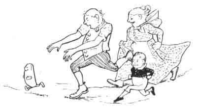 ONCE upon a time there was an old man, and an old woman, and a little boy. One morning the old woman made a Johnny-cake, and put it in the oven to bake. 'You watch the Johnny-cake while your father and I go out to work in the garden.' So the old man and the old woman went out and began to hoe potatoes, and left the little boy to tend the oven. But he didn't watch it all the time, and all of a sudden he heard a noise, and he looked up and the oven door popped open, and out of the oven jumped Johnny-cake, and went rolling along end over end, towards the open door of the house. The little boy ran to shut the door, but Johnny-cake was too quick for him and rolled through the door, down the steps, and out into the road long before the little boy could catch him. The little boy ran after him as fast as he could clip it, crying out to his father and mother, who heard the uproar, and threw down their hoes and gave chase too. But Johnny-cake outran all three a long way, and was soon out of sight, while they had to sit down, all out of breath, on a bank to rest.