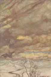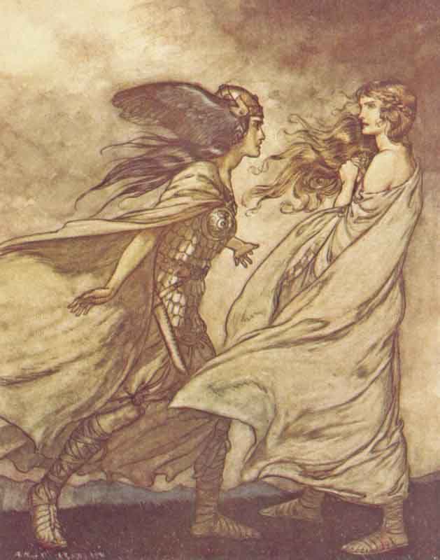 [As Gunther turns impetuously towards the hall with Brünnhilde they are met by the bridal procession coming out. Boys and girls, waving flower-wreathed staves, leap merrily in front. The vassals are carrying Siegfried on a shield and Gutrune on a seat. On the rising ground at the back men-servants and maids are taking implements and beasts for sacrifice, by the various mountain-paths, to the altars, which they deck with flowers. Siegfried and the vassals blow wedding-calls on their horns. The women invite Brünnhilde to accompany them to Gutrune's side. Brünnhilde stares blankly at Gutrune, who beckons her with a friendly smile. Is Brünnhilde is about to step back angrily Hagen comes quickly between them and presses her to wards Gunther, who takes her hand again, whereupon he allows himself to be raised on a shield by the men. Is the procession, scarcely interrupted, moves on quickly again towards the height, the curtain falls.]