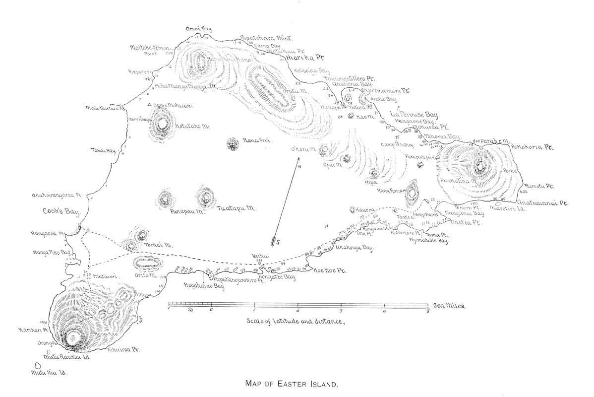 When we approached nearer the land we saw distinctly from a short distance that the description of the sandy and low island did not accord in the least with our discovery. Furthermore, it could not be the same land which the aforesaid voyagers claim to have seen stretching 14 to 16 leagues in front of them, and near the highland which Dampier judged to be the coast-line of the unknown south. That Easter Island can not be the sandy island described by Davis is clear, because that was small and low, while on the contrary Easter Island is high and towers above the sea, having also two elevations rising above the level part. It would not be possible to mistake, even at the dry season of the year, the grass and verdure that covers the hill-sides for barren sand. After the Dutch custom of the day, the admiral assembled the commanders of the three vessels composing his fleet--the Arend, the African Galley, and the Thienhoven--in council to pass formal resolutions claiming the discovery of the land. The proceedings of the assembly state that on Easter day land was sighted about 9 miles distant, of moderate height, and containing an area of about 6 Dutch miles. The weather being calm the vessels were not able to secure an anchorage near the land until the next day, The island was found to be destitute of trees, but with a fertile soil producing bananas, potatoes, and sugar-cane of extraordinary thickness. It was unanimously agreed that both from the difference in the location as well as the appearance of the land seen by Davis, the fact was established beyond doubt that the island just discovered could not be the same. These proceedings, being drawn up, were formally signed by Jacob Roggeveen, Jan Koster, Cornelius Bonman, and Roelof Rosendaal. After sailing from Easter Island the vessels spent a number of days in it search for the low sandy island described by Davis, but not with success.