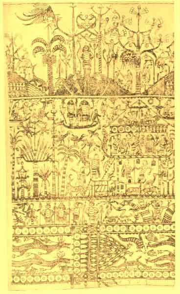 Dyak drawing on bamboo representing mythological scenes in the sprit-world. In the upper row are seen the "soul trees" with the souls ready to be reborn; in the central section, among other things, is the boat in which the souls of the dead are ferried across to the spirit-island. The lowest band shows figures of serpents, fishes, and crocodiles. Ethnographische Rijksmuseum, Leyden, Netherlands.