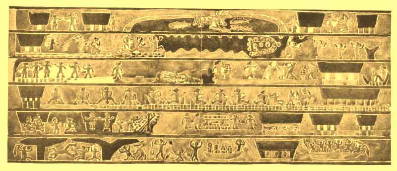 Portion of the carved and painted decoration on the beams of a priest-king's house in the Pelew Islands. The scenes represent episodes in myth and legend, but the particular story to which this series relates is not known. After Meyer, Bilderschriften des ostindischen Archipels und der Südsee, i, Plate III.