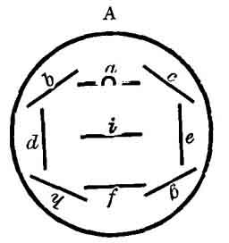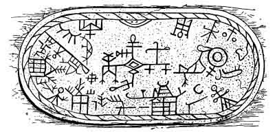 The side of the drum is then gently struck with a little hammer, and according to the position which the seeds take on the marks, the recovery or death of the patient is predicted. The following is a picture of a gypsy drum as given by Dr. WLISLOCKI.