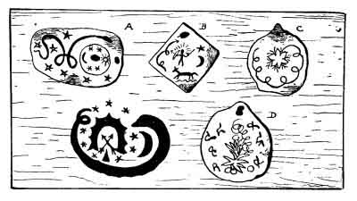 "The amulets," writes M. Elysseeff, "are made of wrought iron and belong to M. Kounavine. The cabalistic sign is designed" (copied?) "by ourselves, thanks to the amiability of a gypsy djecmas (sorcerer) of the province of Novogorod. The amulet A was found by M. Kounavine among the gypsies who roam with their camps in the Ural neighbourhood; some Bessarabian gypsies supplied B; C was obtained from a gypsy sorcerer of the Persian frontier, and D formed a part of some ornaments placed with their dead by gypsies of Southern Russia.