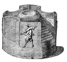 temple, but apartments of the priests, places for victims and sacred utensils, and chapels dedicated to subordinate deities introduced by a more complicated and corrupt worship, and probably unknown to the founders of the original edifice. 1 The portico, which runs parallel with these buildings 2 inclosed the temenos, or area of sacred ground, which in the pyræthia of the Persians was circular, but is here quadrangular, as in the Celtic temple in Zeeland, and the Indian pagoda before described. In the centre was the holy of holies, the seat of the god, consisting of a circle of columns raised upon a basement, without roof or walls, in the middle of which was probably the sacred fire, or some other symbol of the deity. 3 The square area in which it stood, was sunk below the natural level of the ground, 4 and, like that of the little Indian pagoda, appears to have been occasionally floated with water, the drains and conduits being still to be seen, 5 as also several fragments of sculpture representing waves, serpents, and various aquatic animals, which once adorned the basement. 6 The Bacchus περικιονιος here worshipped, was,