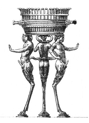 HIS wonderful tripod was found in a votive chapel at Herculaneum. The gracefully-formed corbel is supported by three exquisitely-finished figures: satyrs with their members erect. They are resting their right hands on their hips, and closing their middle fingers in token of silence. They stretch forward their left hands, as if to keep off the profane, who must not take part in the sacrifice. Their tails are gracefully entwined round the central ring.