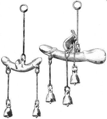 Another phallus in bronze, winged, and ornamented with three small bells.