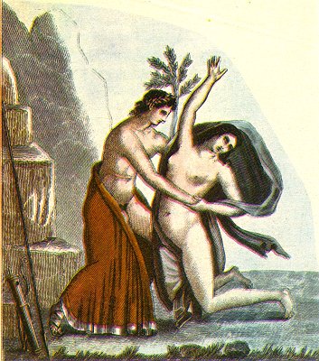 IT is easy to recognise Apollo in the principal personage of this painting; but it would be difficult to assign a name to the young woman whom he is preparing to enjoy. It cannot be Daphne, for the god already wears a crown of laurel. Moreover, the mythologists have attributed to him such a number of mistresses, that it is impossible to ascertain whether the painter intended here to represent Coron is the mother of Æsculapius, Clymenes the daughter of the Ocean and the mother of Phaethon, Clytie, Leucothea, or some other.