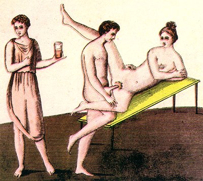 THIS erotic scene is remarkable for the presence of the cubicular slave, a beautiful youth, who brings to the married pair a drinking-vessel, probably containing a comforting liquor, 1 turning his head aside as he presents it to them, as if he blushed at their nakedness; with the same hand that holds the vessel he raises two fingers, a gesture which in our own day we should call the cuckold's sign, but which was not in ancient times a mark of insult or derision. It was simply a gesture to which was attributed the virtue of driving away witchcraft; and, as we said before, this superstition still exists in Italy. Possibly the young