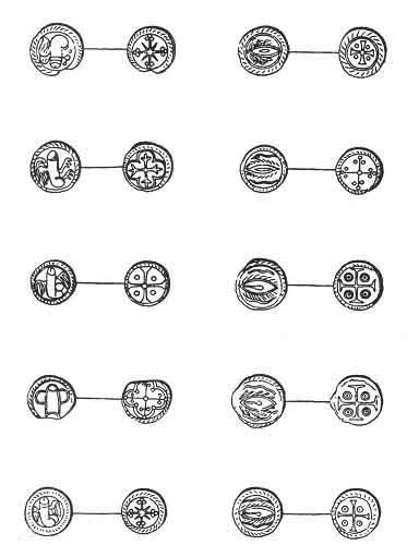 proof of its popular character), and ranging in date perhaps from the fourteenth to the earlier part of the sixteenth century. As we owe our knowledge of these phallic amulets almost entirely to one collector, M. Forgeais of Paris, who obtained them chiefly from one source--the river Seine, our present acquaintance with them may be considered as very limited, and we have every reason for believing that they had been in use during the earlier period. We can only illustrate this part of the subject by describing a few of these mediæval phallic amulets, which are preserved in some private collections; and we will first call attention to a series of objects, the real purpose of which appears to be very obscure. They are small leaden tokens or medalets, bearing on the obverse the figure of the male or female organ, and on the reverse a cross, a curious intimation of the adoption of the worship of the generative powers among Christians. These leaden tokens, found in the river Seine, were first collected and made known to antiquaries by M. Forgeais, who published examples of them in his work on the leaden figures found in that river. 47 We give five examples of the medals of each sex, obverse and reverse. 48 It will be seen that the phalli