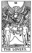 The sun shines in the zenith, and beneath is a great winged figure with arms extended, pouring down influences. In the foreground are two human figures, male and female, unveiled before each other, as if Adam and Eve when they first occupied the paradise of the earthly body. Behind the man is the Tree of Life, bearing twelve fruits, and the Tree of the Knowledge of Good and Evil is behind the woman; the serpent is twining round it. The figures suggest youth, virginity, innocence and love before it is contaminated by gross material desire. This is in all simplicity the card of human love, here exhibited as part of the way, the truth and the life. It replaces, by recourse to first principles, the old card of marriage, which I have described previously, and the later follies which depicted man between vice and virtue. In a very high sense, the card is a mystery of the Covenant and Sabbath.