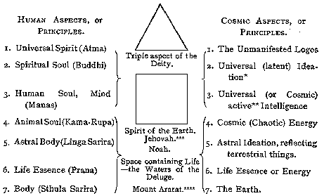 Thus Number Seven, as a compound of 3 and 4, is the factor element in every ancient religion, because it is the factor element in nature. Its adoption must be justified, and it must be shown to be the number par excellence, for, since the appearance of "Esoteric Buddhism," frequent objections have been made, and doubts expressed as to the correctness of these assertions.